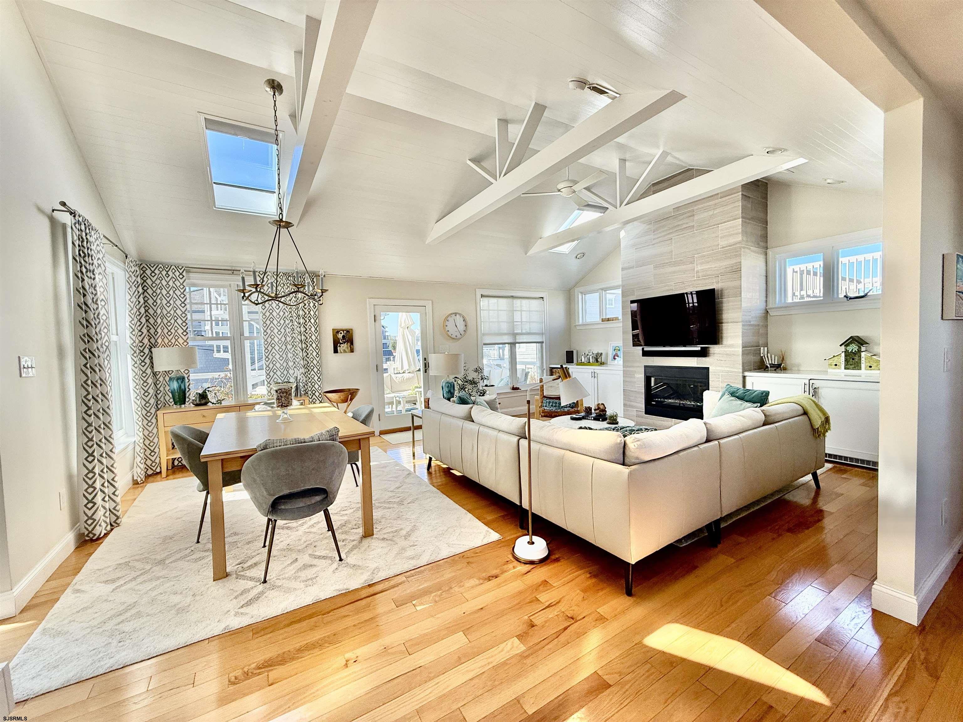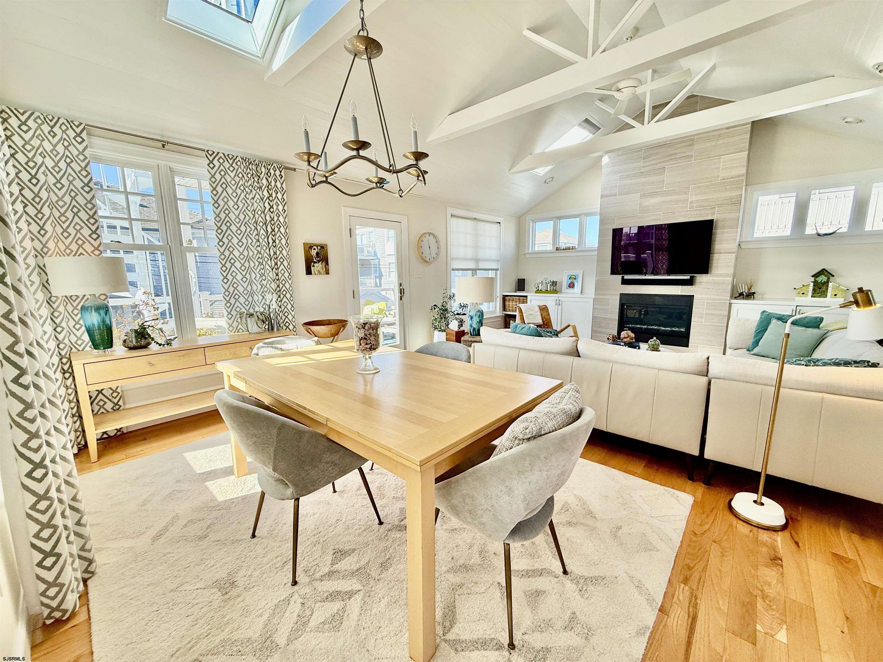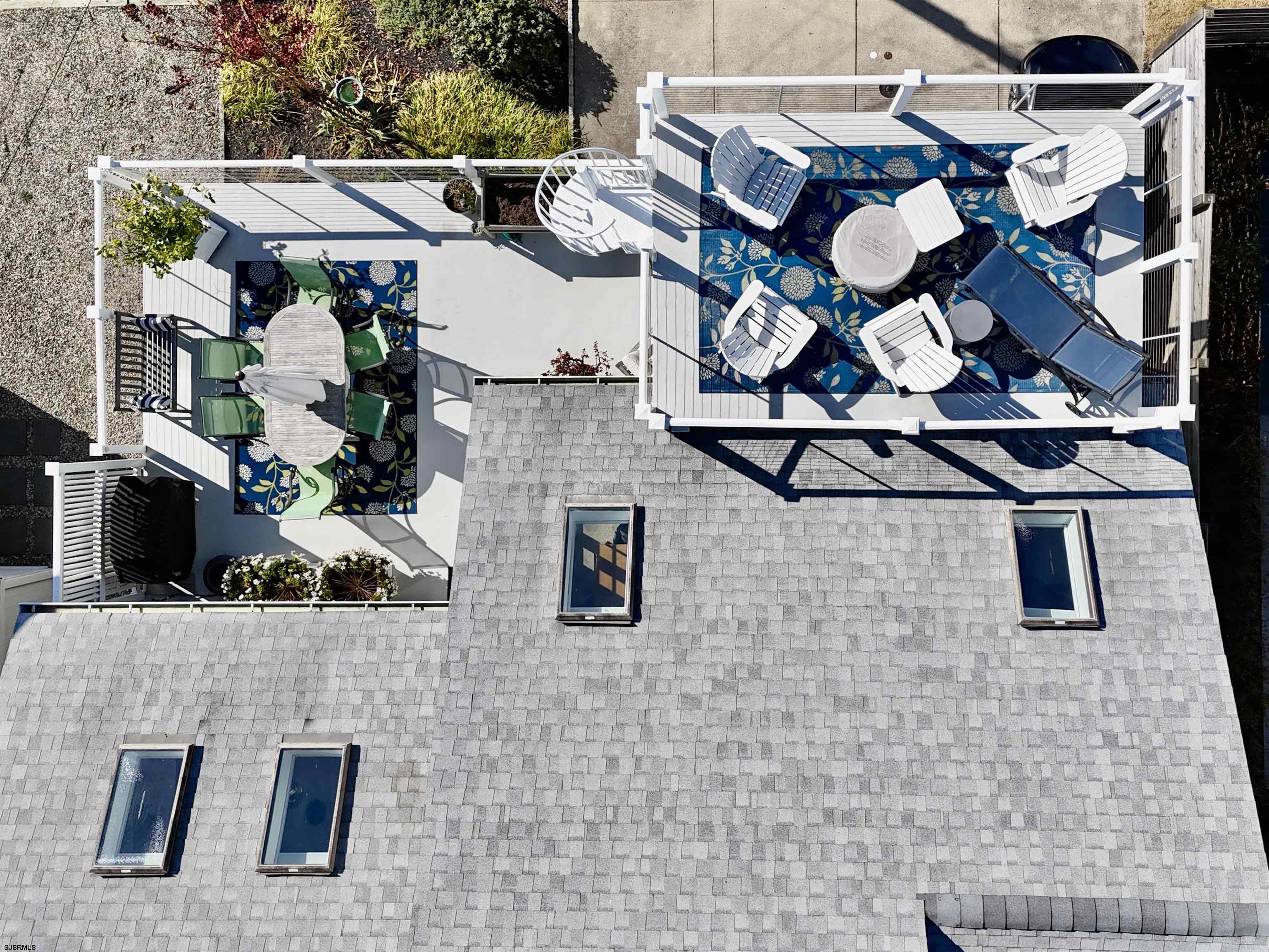 Nestled just one in from the beach path this 4 bedroom 3 1/2 bath beach house is located in the sought after Brigantine A-Zone. There are 3 generous size bedrooms downstairs, 2 full baths and a laundry room. Upstairs is the living area that is completely open that flows from the kitchen to the dining area and living room. Great for entertaining! The vaulted ceilings plus skylights let in an abundance of natural light. The updated kitchen features top of the line stainless steel appliances quartz counter tops and soft close cabinetry. The sliding glass doors lead to an expansive fiberglass deck and spiral staircase that has an amazing view of the ocean to the north and south from the living area and rooftop level. The primary bedroom is also located on the 2nd level and has expansive ocean views from the wrap around windows. You will enjoy the stone wall fireplace and convenient beverage fridge in the living room. The owners renovated the home in 2014 and that included double hung Marvin windows, Hardee board siding, tankless water heater, new roof, HVAC, addition of a front porch, sprinklers front and back and more. The fiberglass decks were just resurfaced in the spring of 2024. There is also an electric vehicle charger in the garage with addtional parking for 2 cars in the driveway. Don’t miss this special opportunity. Schedule your showing today.