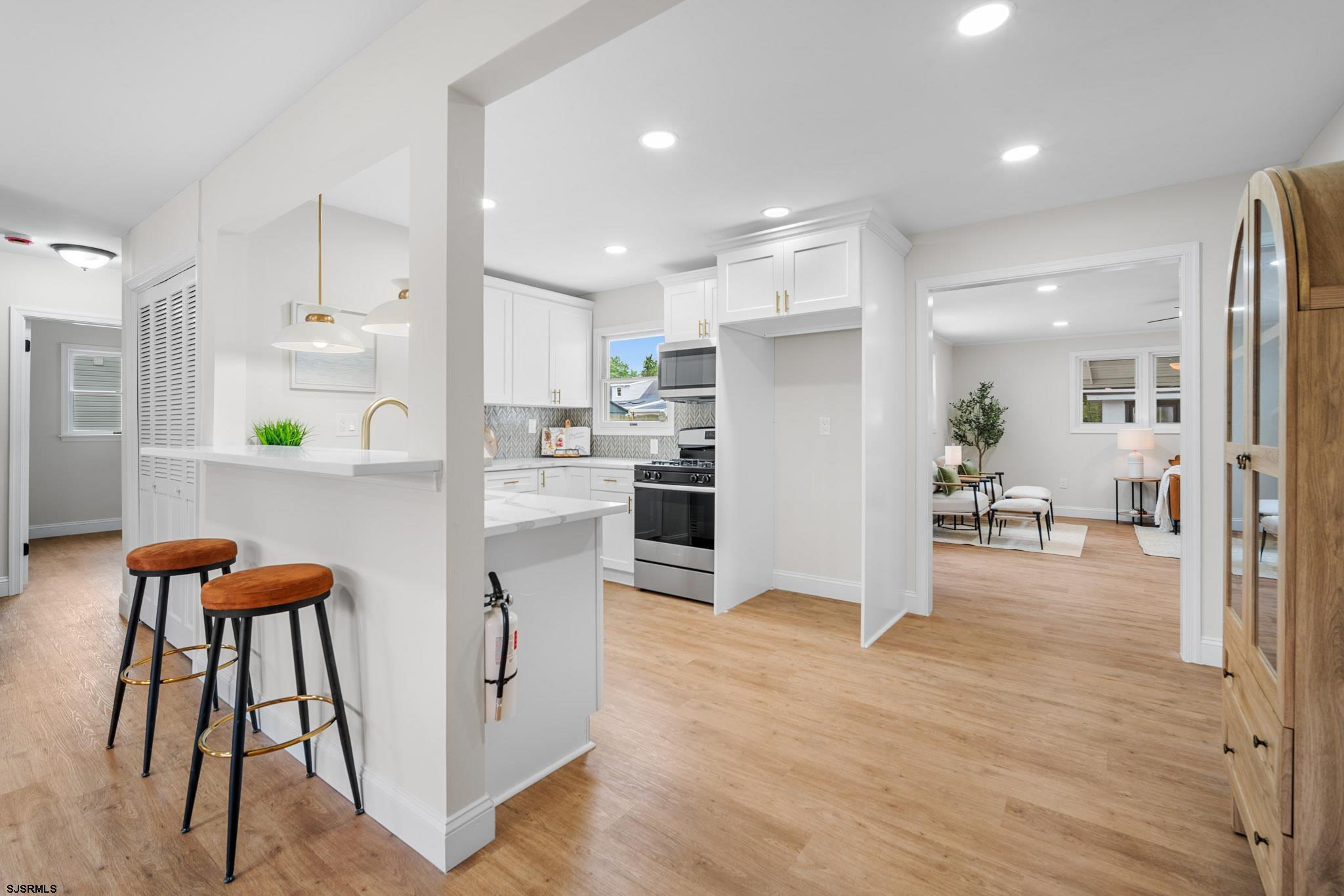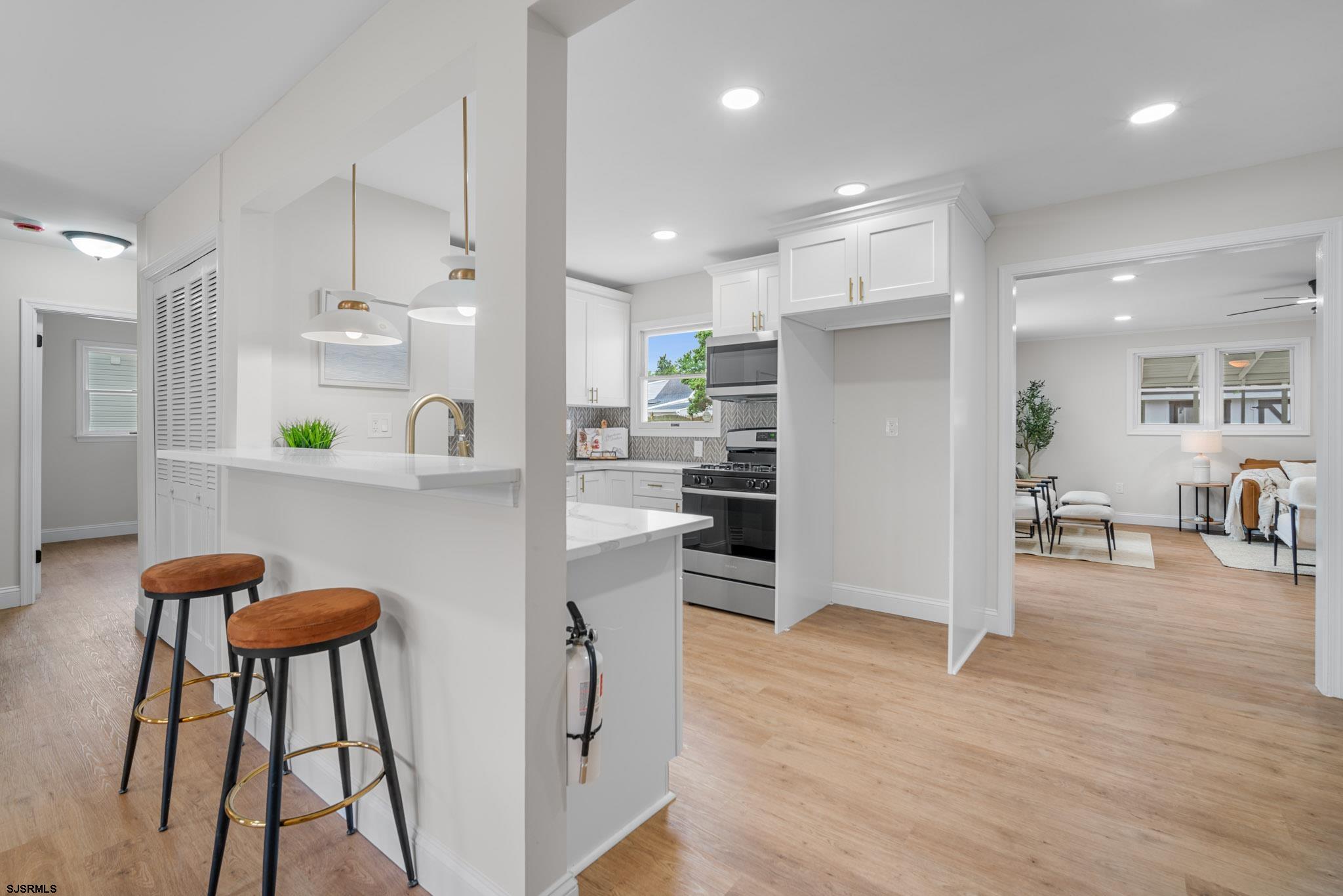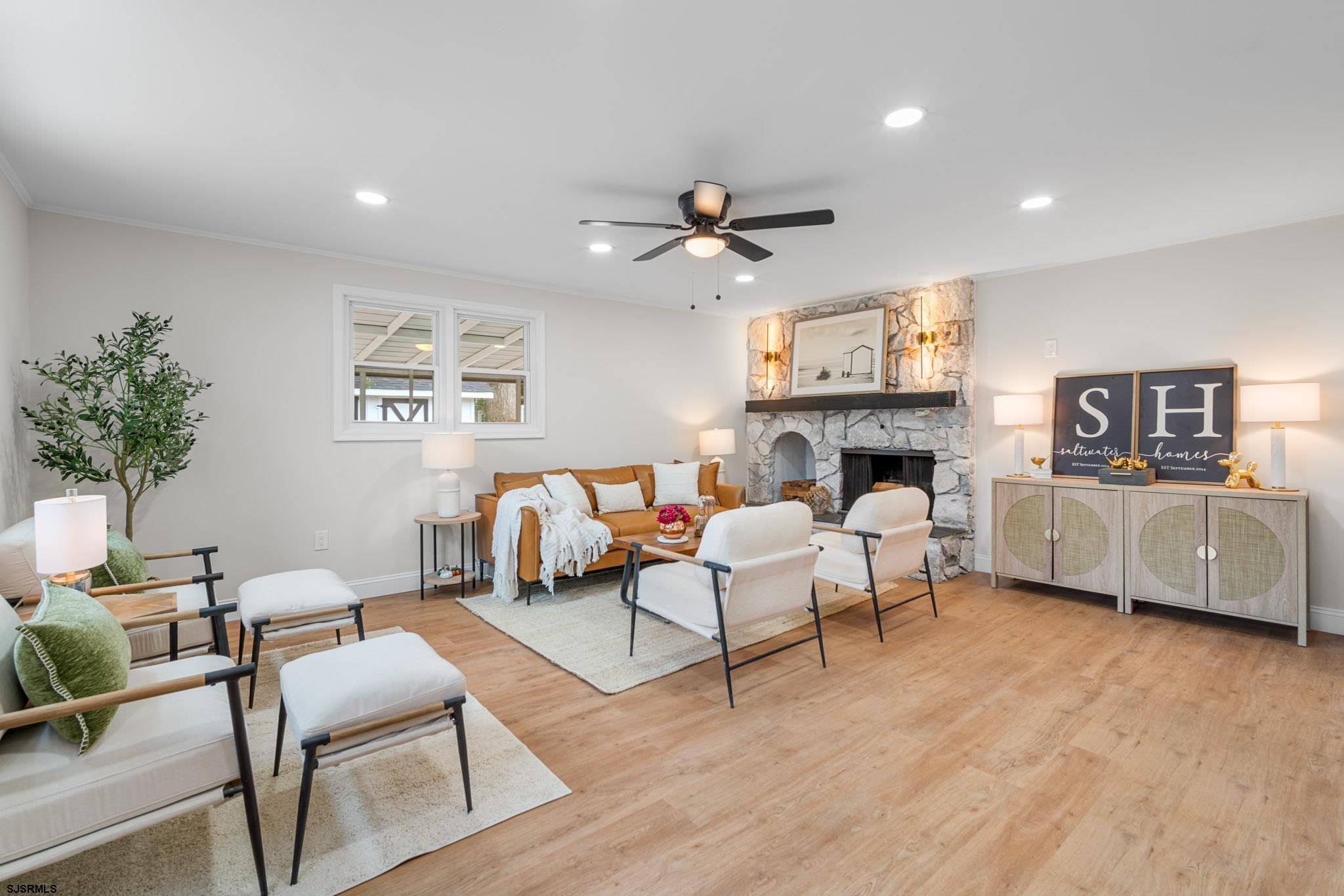 Classic Cape Cod vibes meet bright, modern luxury in this gorgeously renovated gem in Somers Point! Step inside this stylish 4 bed 2 bath stunner and instantly feel right at home! From its spacious & airy open concept layout, to the warm luxury vinyl plank flooring and recessed lighting through out, every inch feels fresh, bright, and thoughtfully designed. The kitchen is a showstopper, with soft close dove-tailed cabinets, sparkling quartz countertops, a glass tile backsplash, and stainless steel appliances plus a spacious breakfast bar perfect for coffee or cocktails! Both bathrooms have been transformed into spa-like retreats, with custom tiled showers & Va cities topped with real stone countertops for an elegant touch. On chilly evenings, curl up beside the built in wood burning fireplace in the living room or sip your morning coffee on the screened-in porch overlooking the fully fenced yard, ideal for pets, outdoor play, or summer barbecues! *Backyard is seeded with eco soil (rich soil + seed + fertilizer)* With a brand new roof, a new HVAC system, and move-in readiness from top to bottom, this sparkling home offers functionality and style in equal measure. Schedule your tour today!