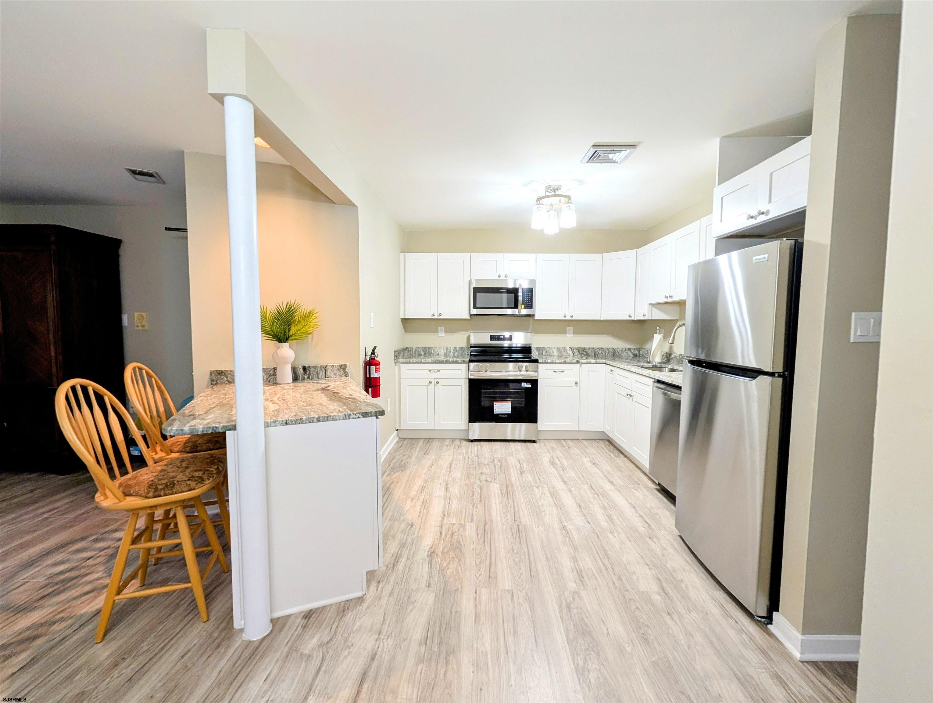 PRICED TO SELL FAST!! Just Bring Your Clothes! Maintenance free living at this RENOVATED 2 BR, 1 BA, 2nd floor condo at Harbour View Condos has NEW everything! New flooring, freshly painted thru-out (popcorn ceiling removed) New kitchen with granite counters, stainless appliances, new ceiling fans, lighting fixtures & blinds, updated bath with new vanity & toilet, new washer & dryer, and new Central air unit. 1 bedroom is huge with double closets. 2nd BR could fit a queen or bunk beds. Partially furnished with beautiful new couch set, a bedroom set, and kitchen table. Relax on your balcony after a fun day enjoying Bay Avenue activities. Also offers a private parking lot and shared BBQ patio area. Walkable to all the restaurants, bars, marinas, SP beach, & hospital. Minutes to Ocean City & Longport beaches too. This could be the perfect FT residence or a seasonal getaway for your family. Private & secure entrance & lobby make this condo even more desirable.